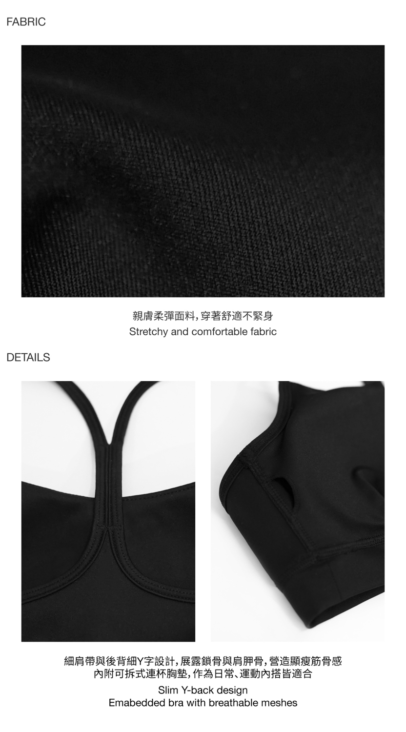 - 細肩帶與後背細Y字設計,展露鎖骨與肩胛骨,營造顯瘦筋骨感