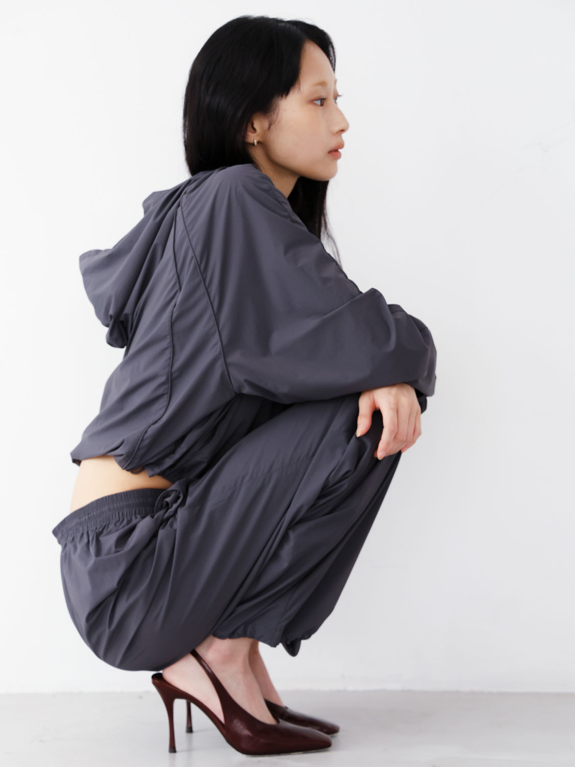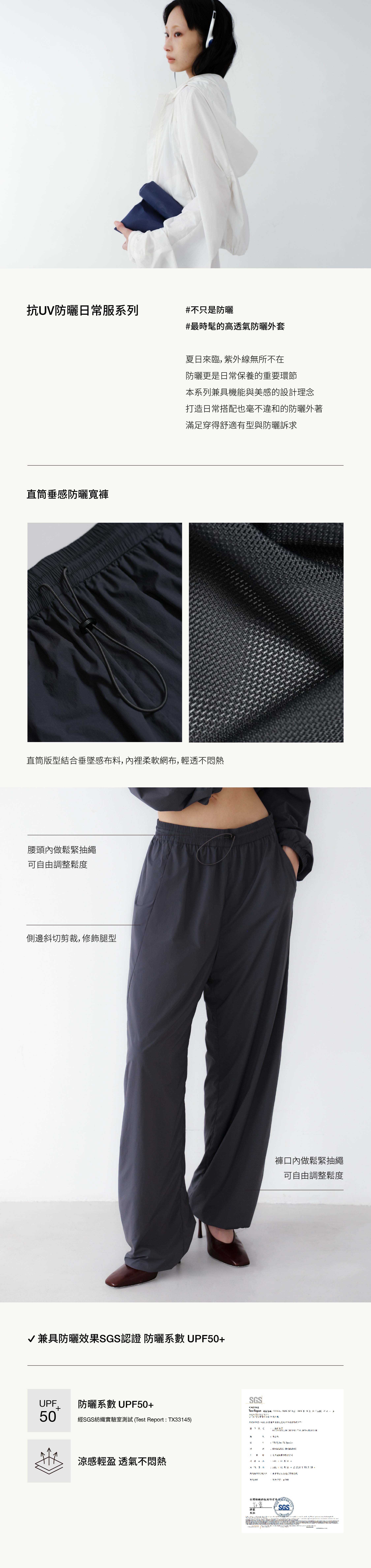 -The fabric is light and comfortable, and there is soft mesh inside, which is breathable, cool and not stuffy. -The straight version is combined with drapey fabric to modify the body shape without making the body look bloated. -Cut on the side to trim the leg lines -Elastic drawstrings are used in the waistband and trouser cuffs, and the looseness can be adjusted freely to create different effects. - Fabric Patent Certificate ・Sun protection factor UPF50+: Tested by SGS Textile Laboratory (Test Report: TX33145)