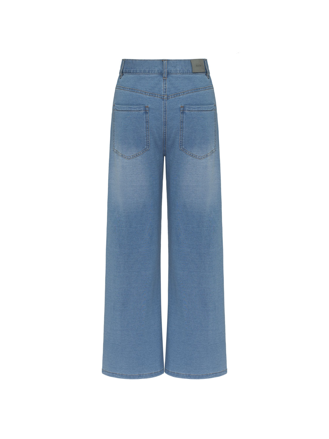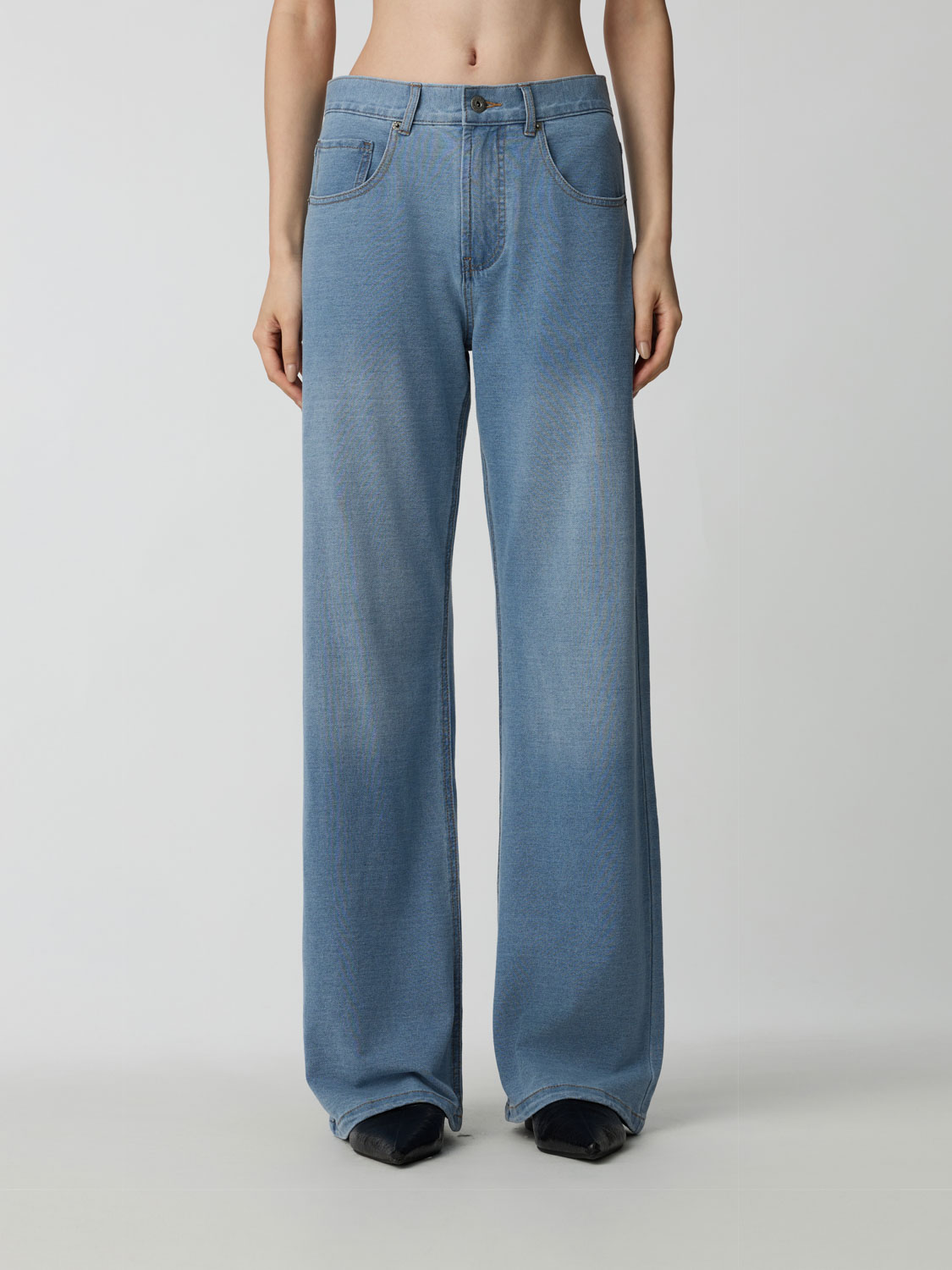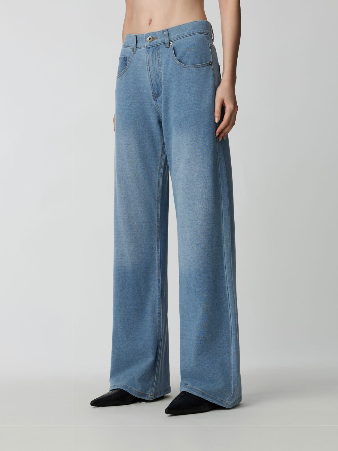 C-line - Light, stiff and soft knitted denim fabric with elasticity, creating an overall casual and handsome look -Mid-length micro-flared version with loose content, leg seam design makes it visually slimmer -Thighs are naturally colored with narrow lines