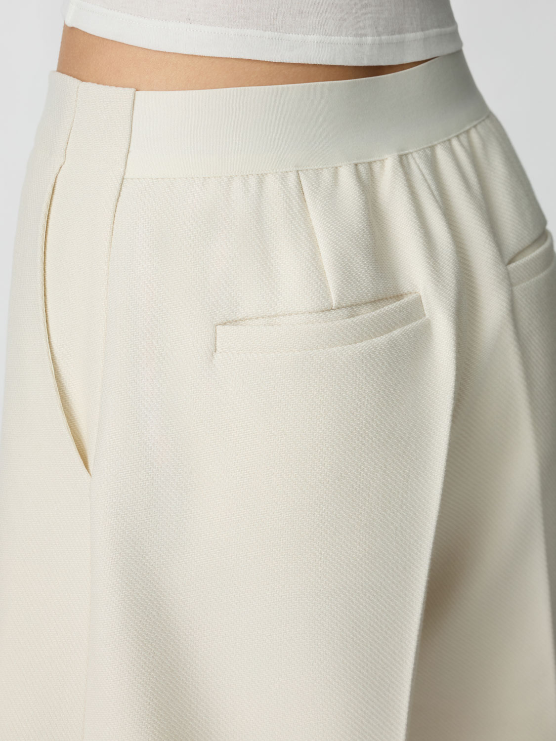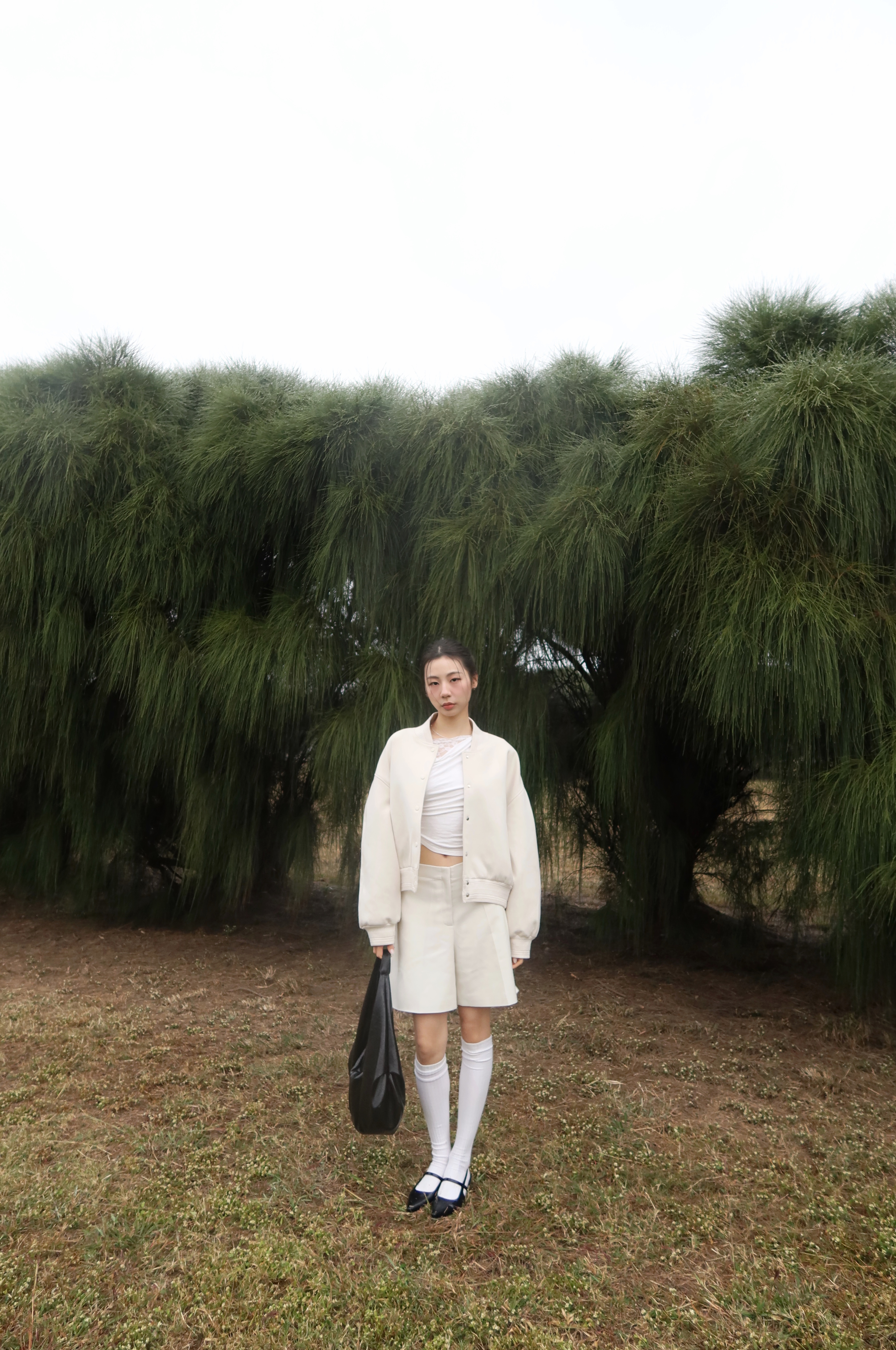 •正面前開拉鍊,背面腰頭拼接毛織感細緻鬆緊帶,外觀整體和諧