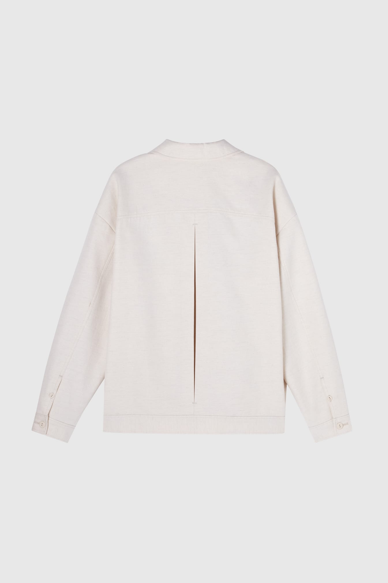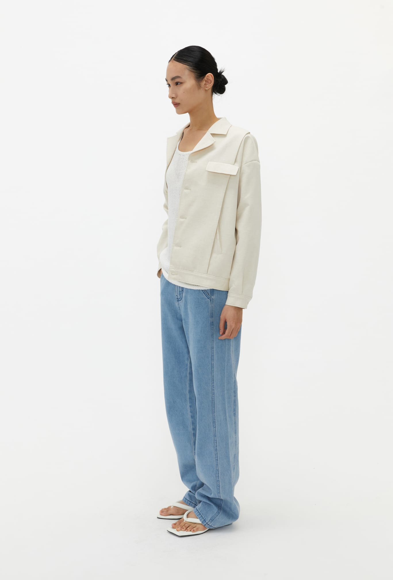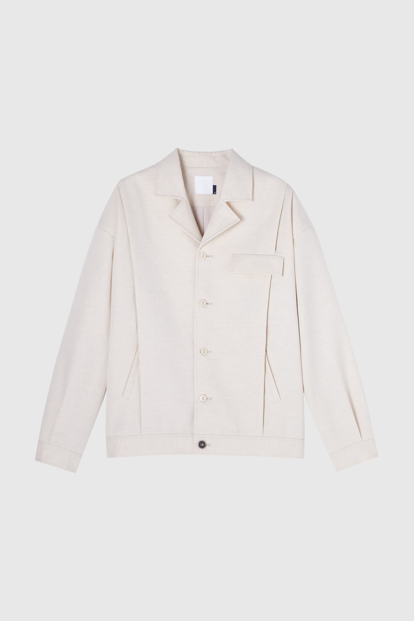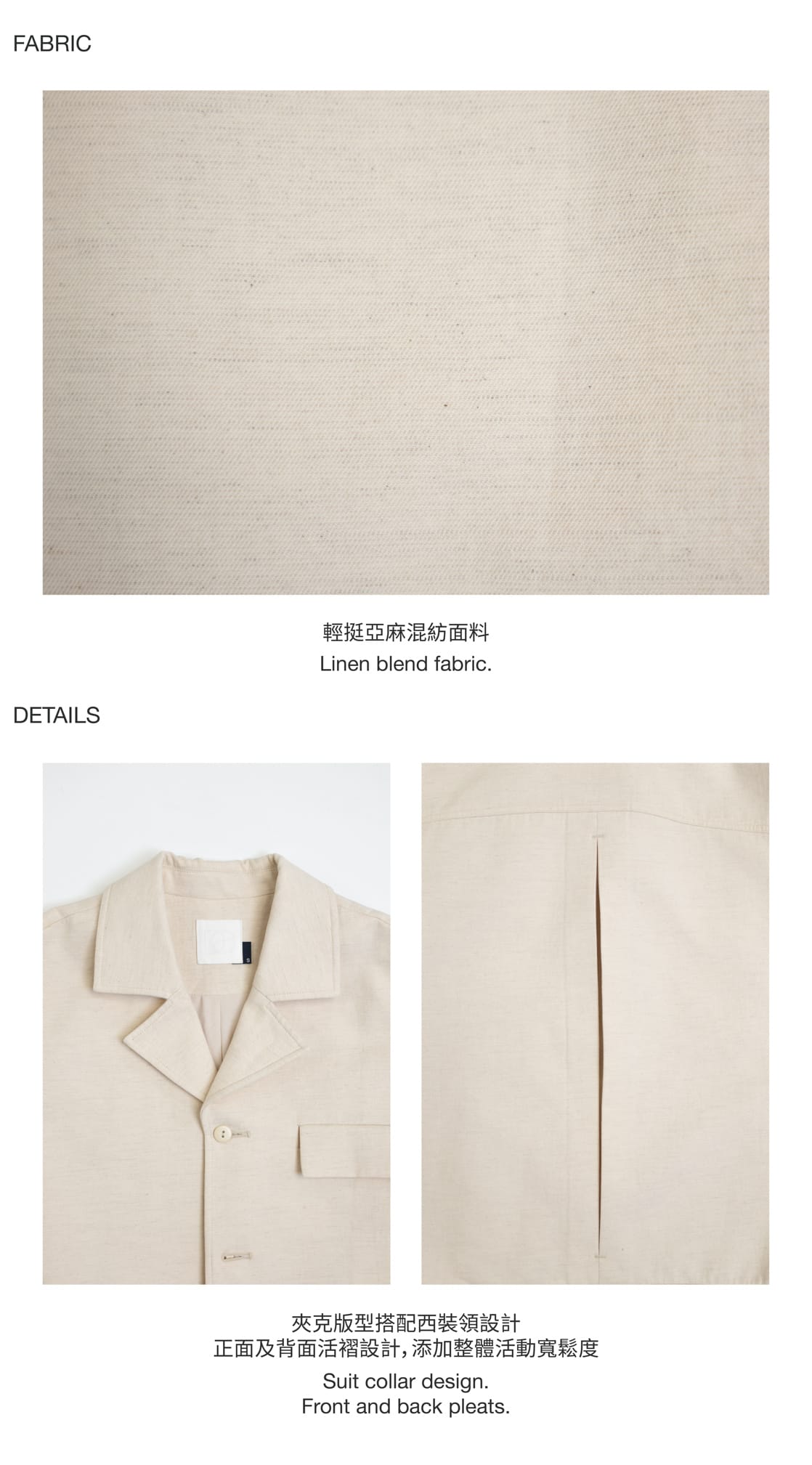 L-line ・Light and stiff linen blend fabric creates a high-end, relaxed and casual wearing style ・ Jacket style with suit collar design, balancing casual and formal atmosphere ・The pleat design on the front and back increases the overall looseness of movement and creates ingenious styling details ・The inverted trapezoid shape is tapered at the hem, providing a solid and spiritual atmosphere