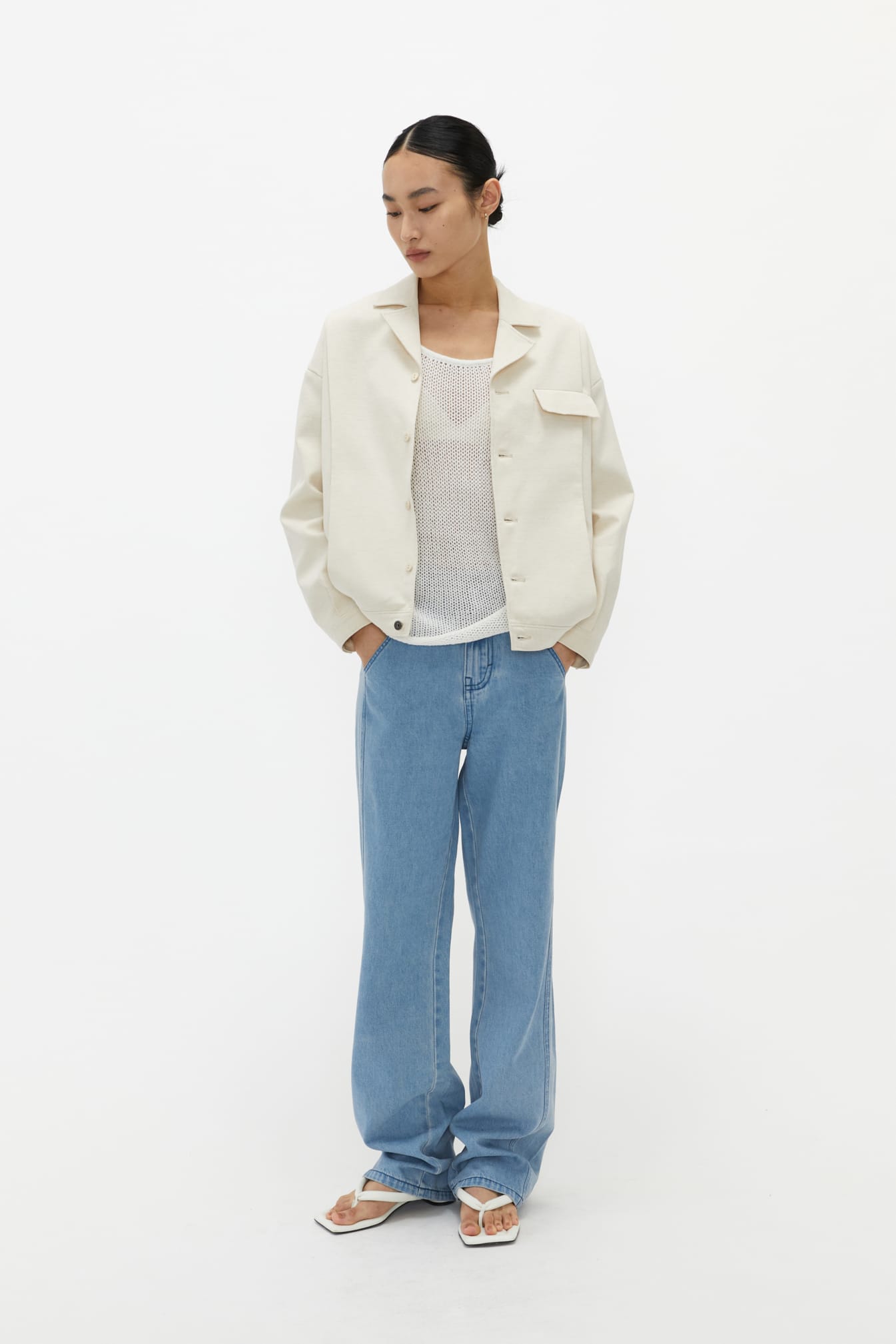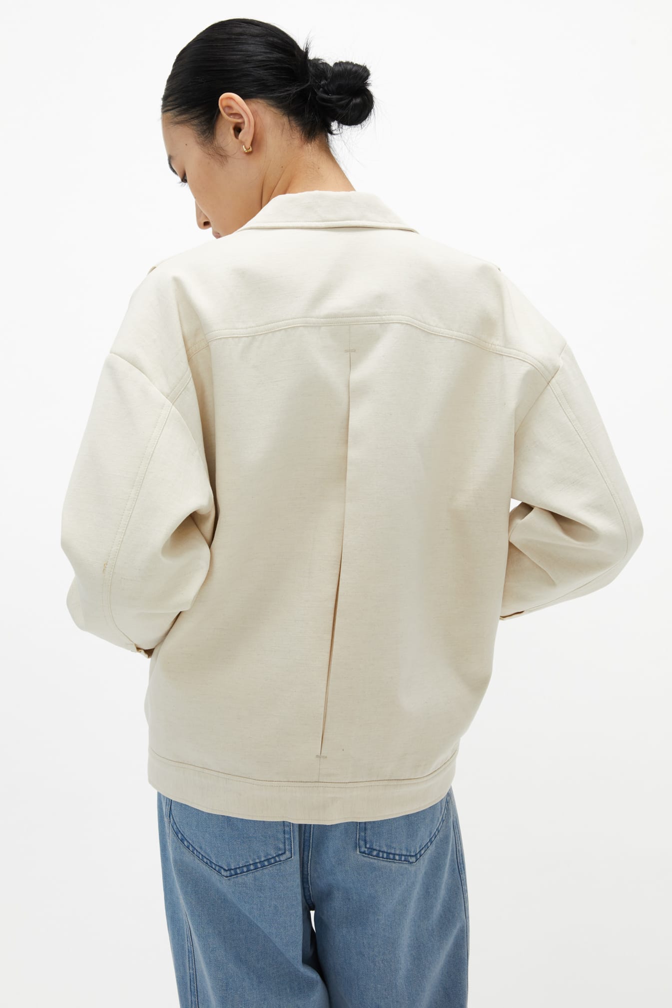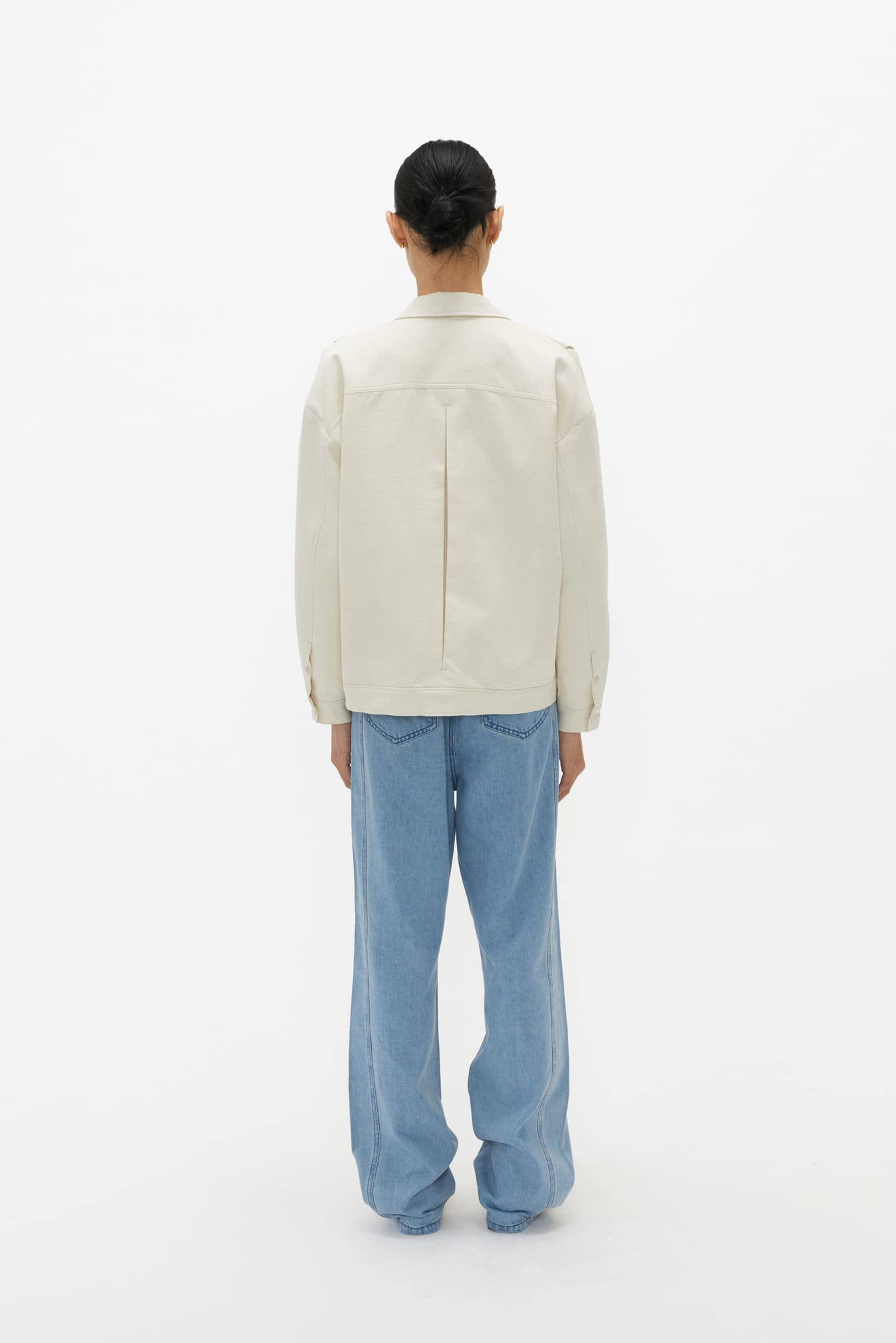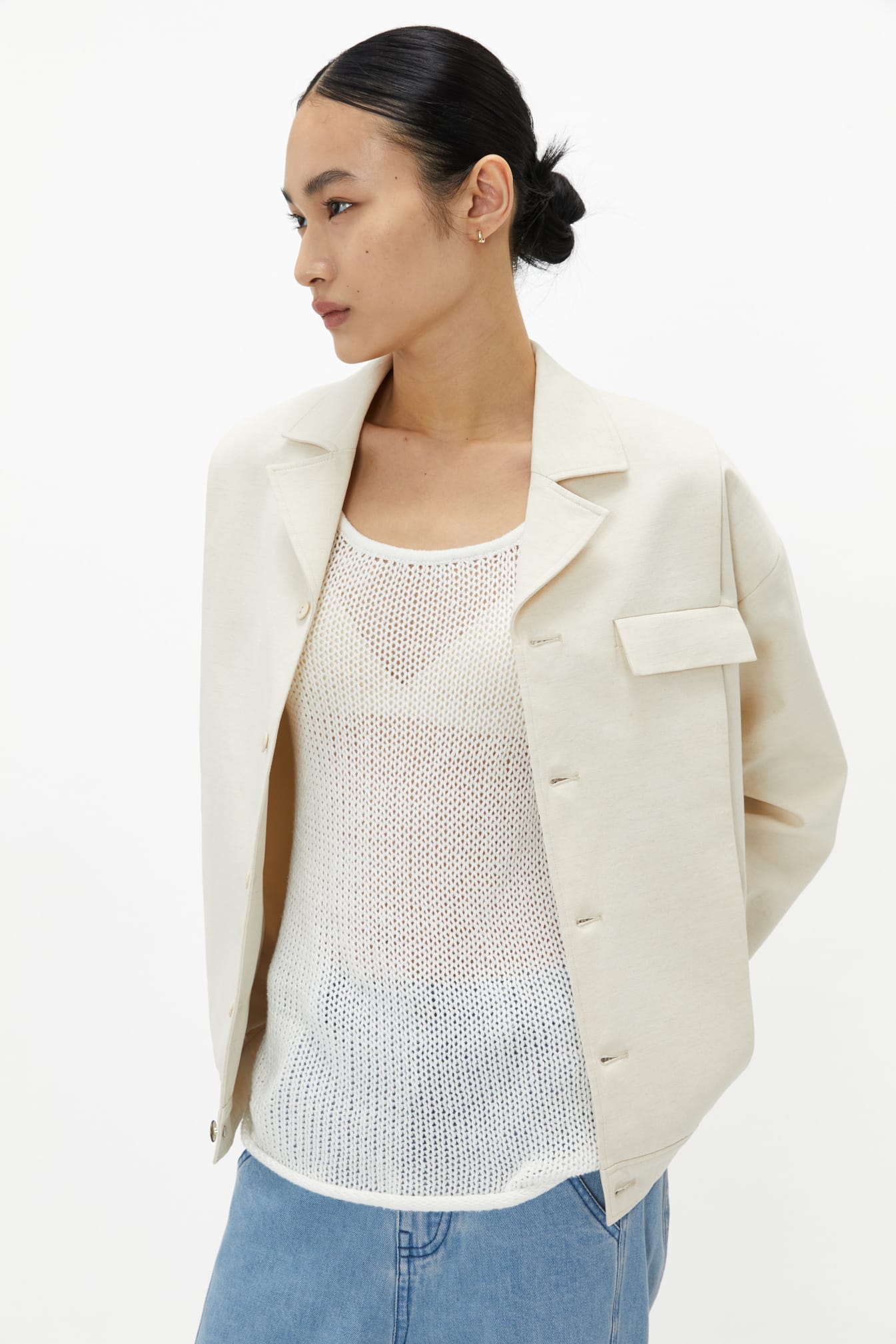 L-line ・Light and stiff linen blend fabric creates a high-end, relaxed and casual wearing style ・ Jacket style with suit collar design, balancing casual and formal atmosphere ・The pleat design on the front and back increases the overall looseness of movement and creates ingenious styling details ・The inverted trapezoid shape is tapered at the hem, providing a solid and spiritual atmosphere