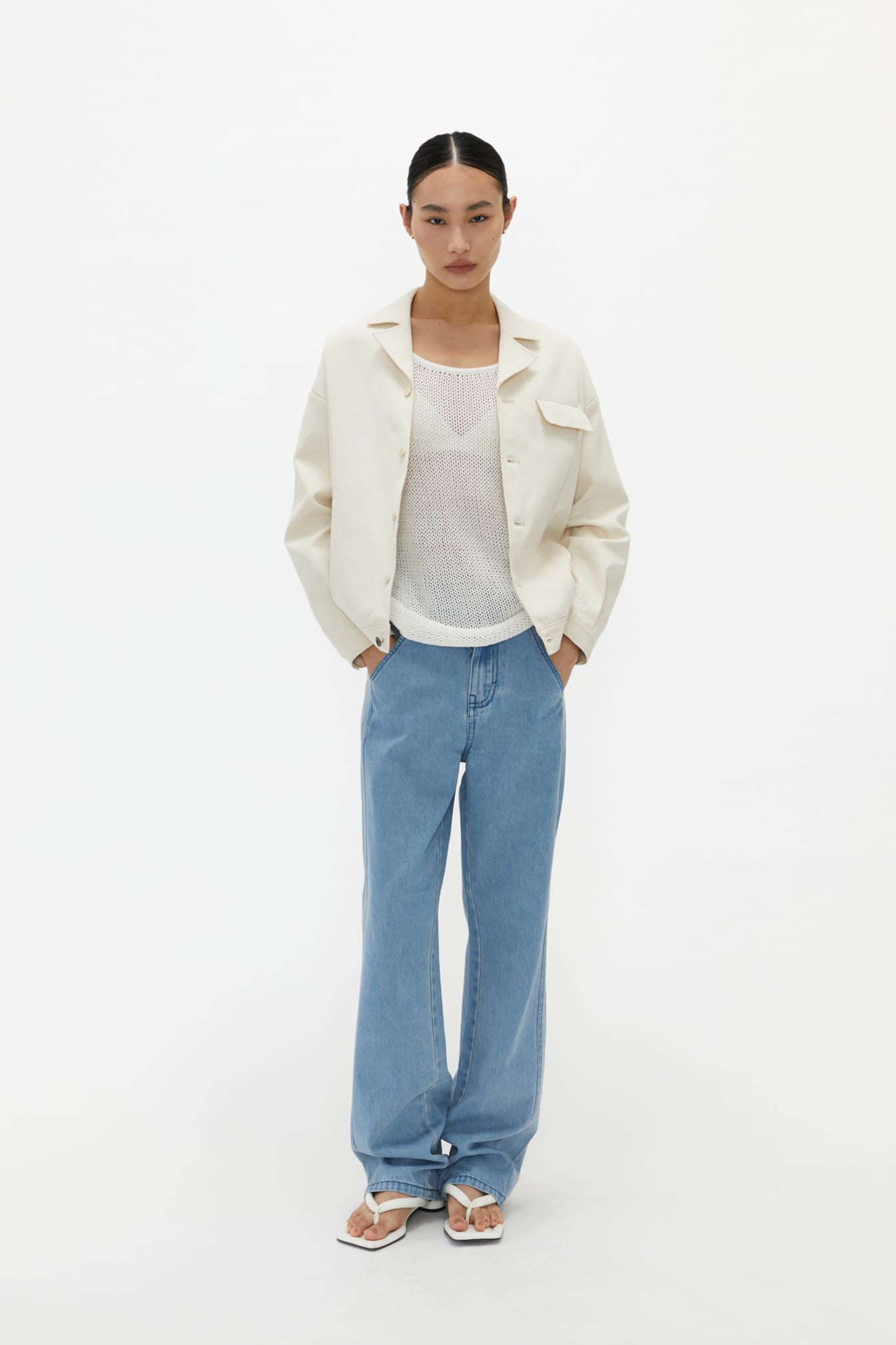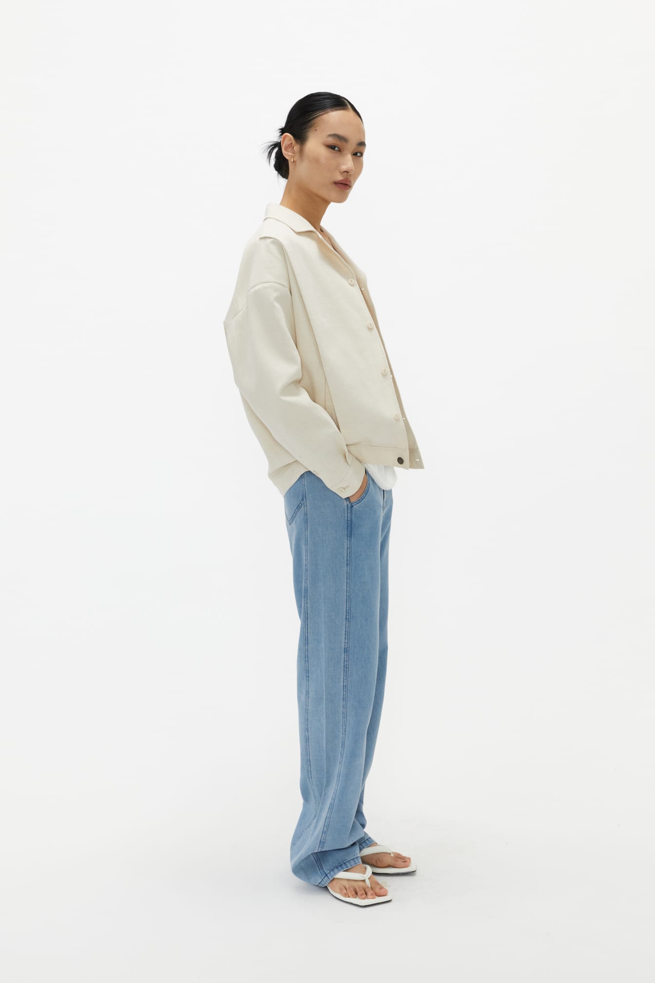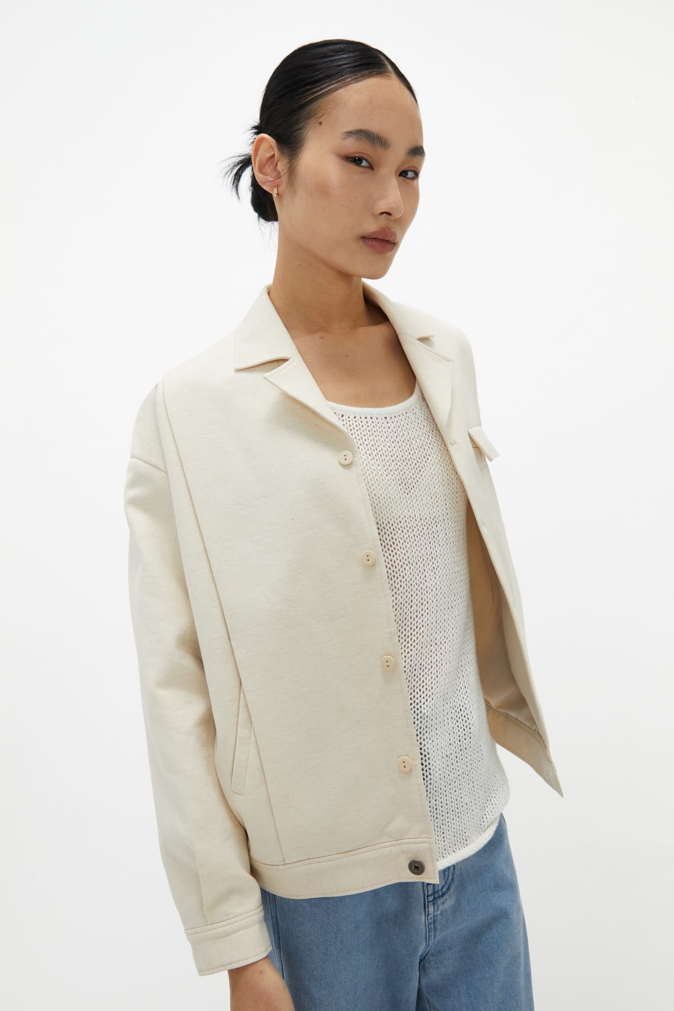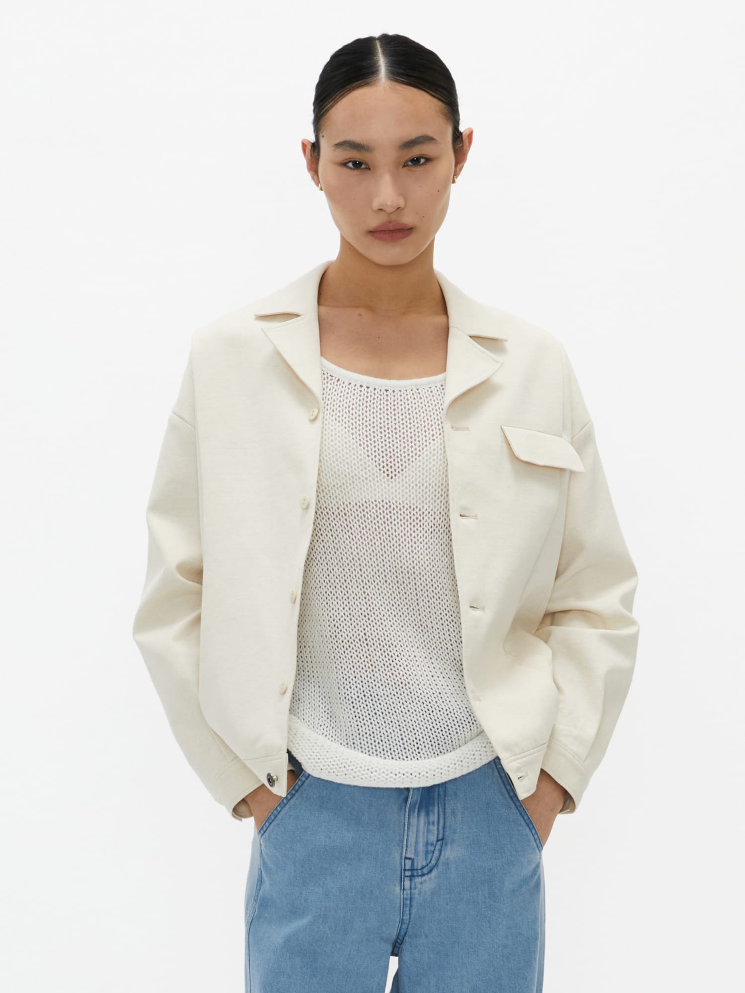 L-line ・Light and stiff linen blend fabric creates a high-end, relaxed and casual wearing style ・ Jacket style with suit collar design, balancing casual and formal atmosphere ・The pleat design on the front and back increases the overall looseness of movement and creates ingenious styling details ・The inverted trapezoid shape is tapered at the hem, providing a solid and spiritual atmosphere