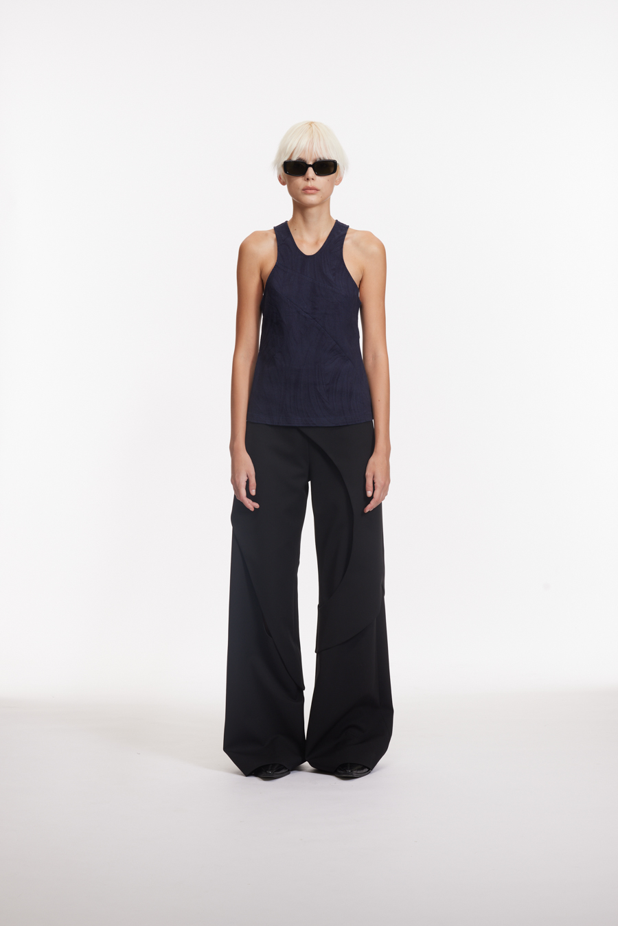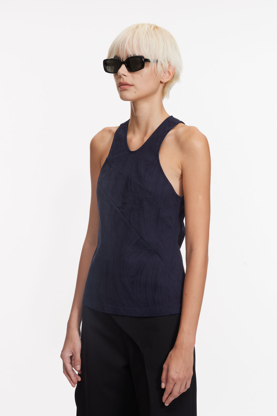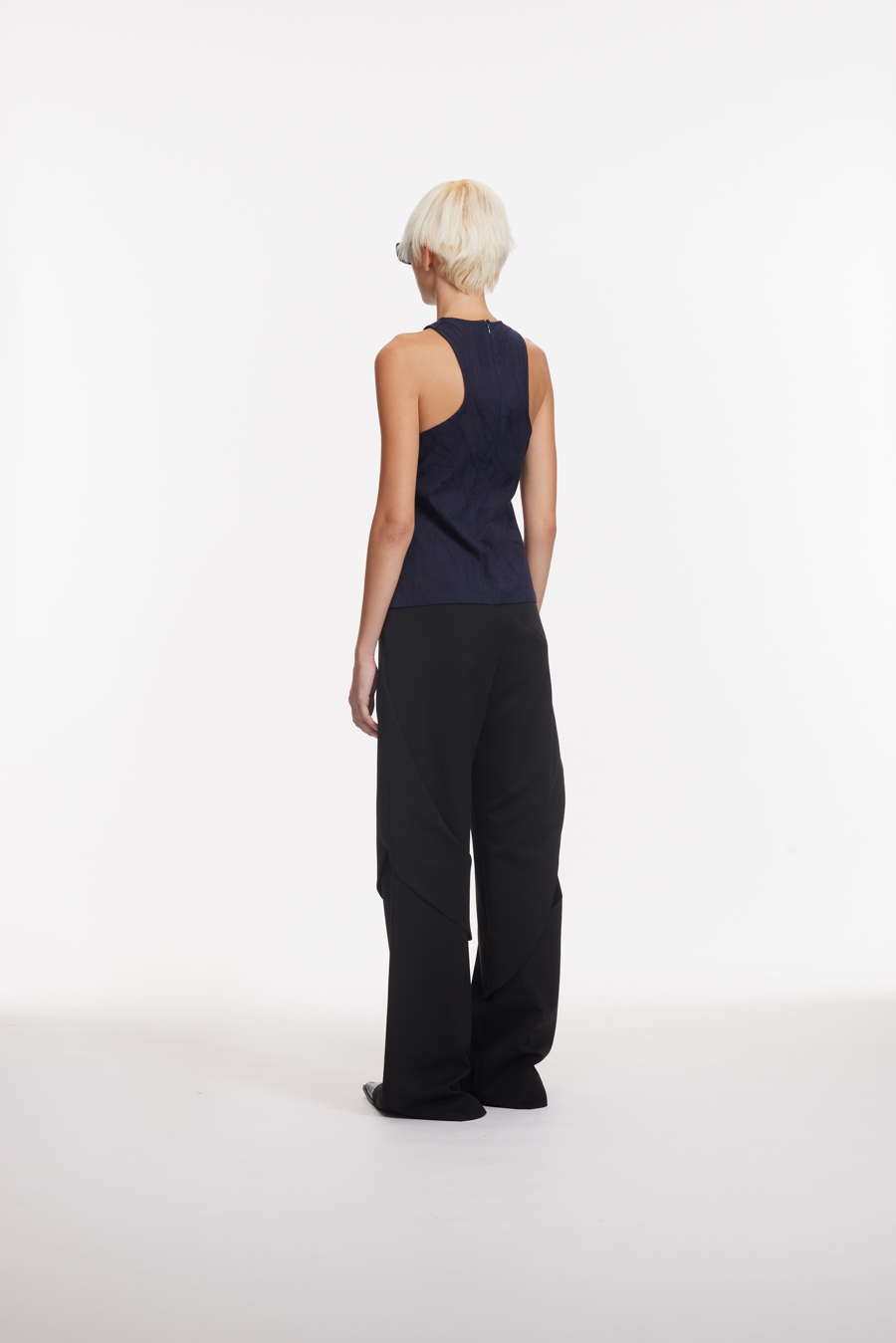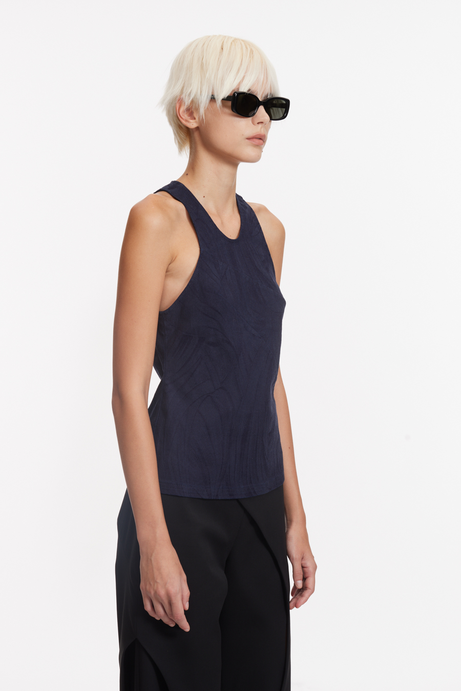 ・Textured jacquard fabric ・Narrow V-neck design ・Sculpted tailoring ・Curved front